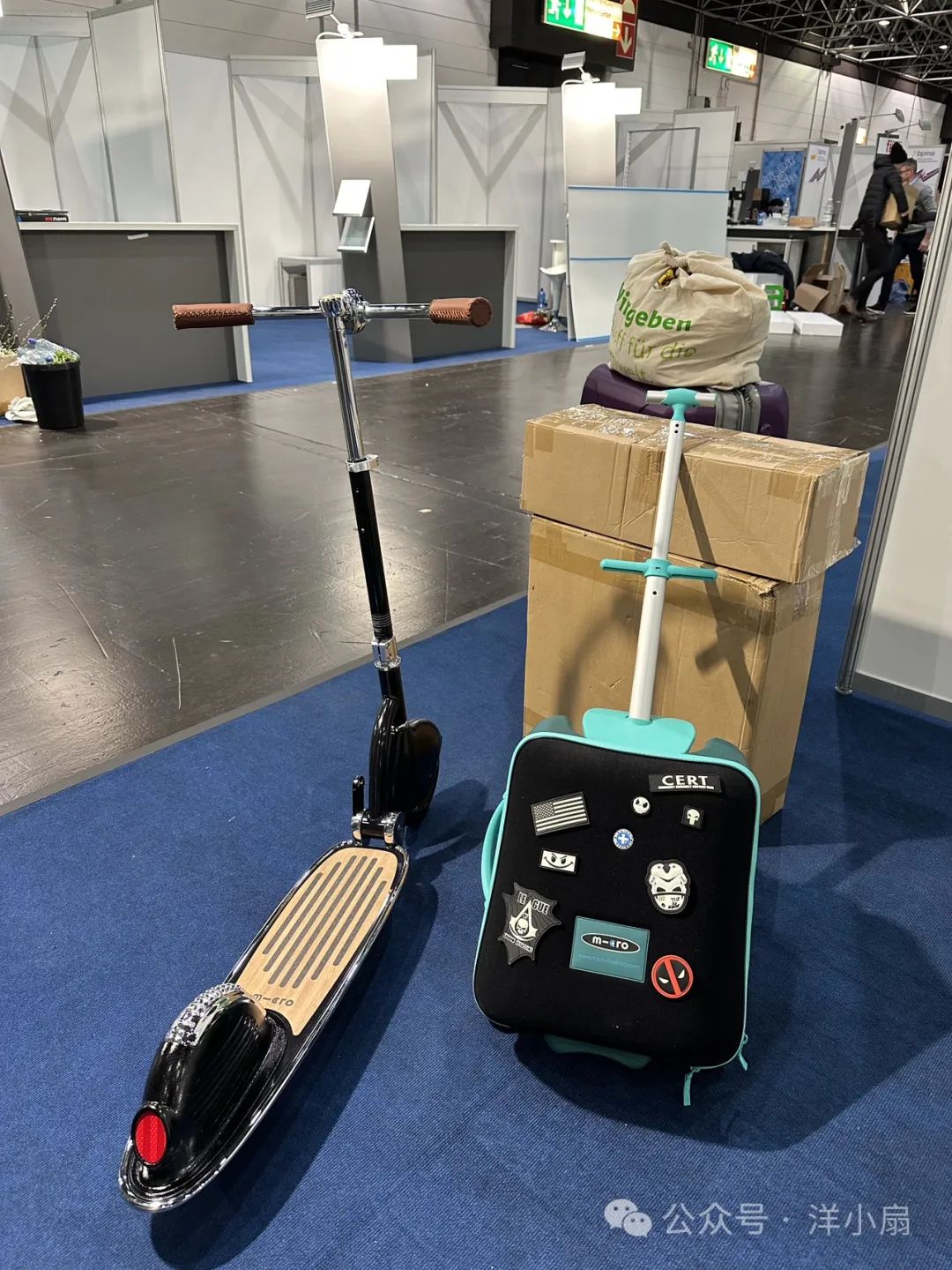 我在展会上给皓皓买了一个可以坐着的行李箱,还给自己买了一辆滑板车。这个滑板车不是电动的,需要助力,款式有点复古,深得我心。