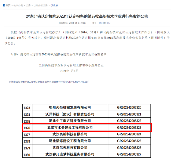 1月4日,捷报传来,武汉控股公司旗下武汉市水务建设工程有限公司(以下简称“水务建设工程公司”)、红安既济水务环境科技有限公司(以下简称“红安既济公司”)获评国家“高新技术企业”。累计2020年、2021年武汉水务环境科技有限公司(以下简称“水务环境公司”)、武汉市城市排水发展有限公司(以下简称“排水公司”)先后荣获“高新技术企业”认定的公司,至此,武汉控股公司旗下共有4家“高新技术企业”。