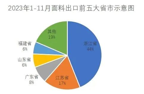 东南沿海是面料出口的主要地区,浙江、江苏、广东、山东和福建,前五大出口省份合计占比超85%。各省市出口均有所下降,浙江、江苏、广东、山东、福建出口降幅分别为5.6%、15.4%、21.6%、14.1%和31.4%。