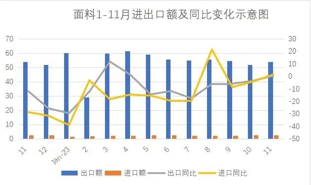 2023年11月,我国面料进出口总额为56.5亿美元,同比增长0.5%。其中,出口53.8亿美元,同比增长0.4%;进口2.7亿美元,同比增长1.5%,进出口都为2023年来首次增长。