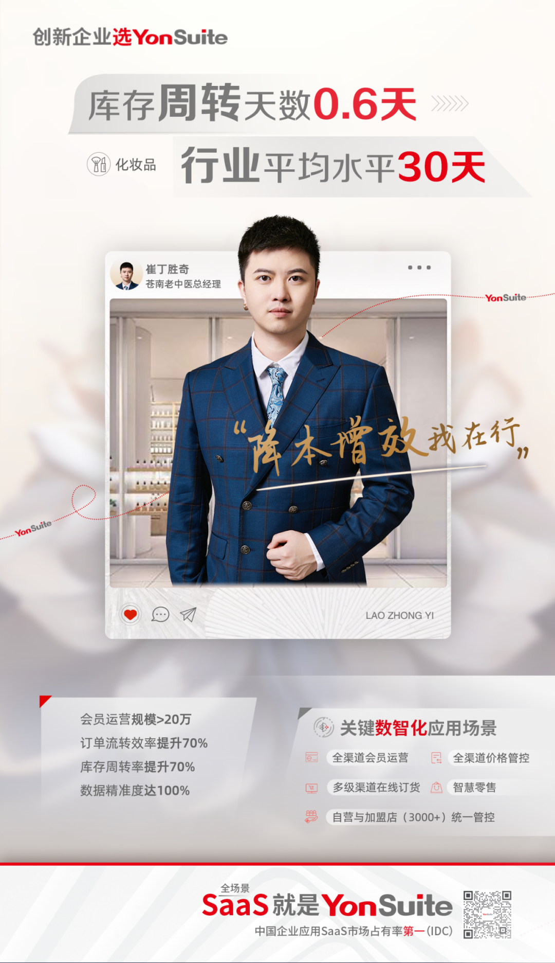 通过YonSuite自营与加盟店统一管控数智飞轮,许多企业的关键数据指标都优于行业平均水平。例如,苍南老中医库存周转天数仅为0.6天,远远低于行业平均的30天。