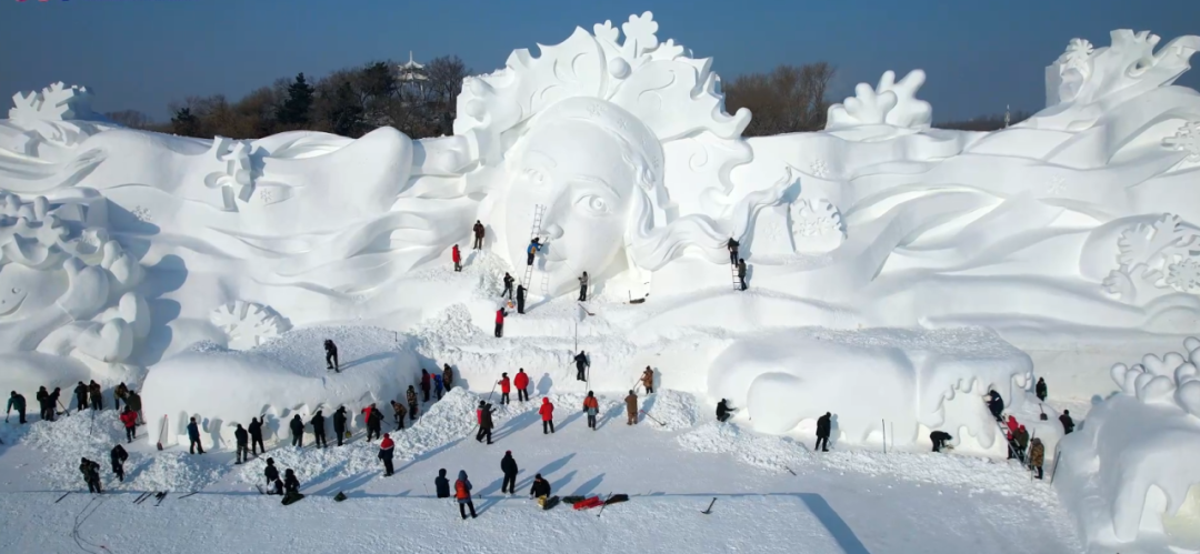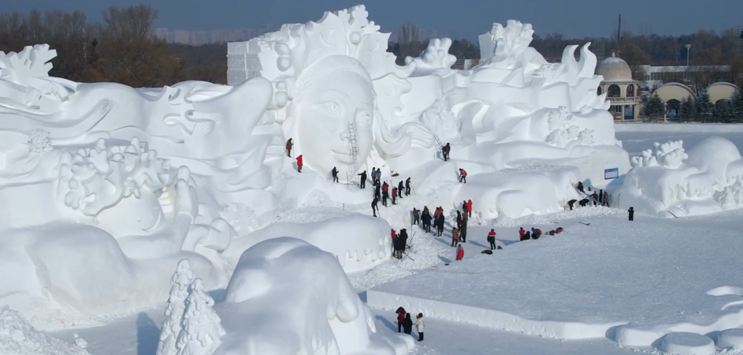 主塑总设计师张宁阁带领团队,在哈尔滨零下二三十摄氏度的严寒天气里,全凭双手雕刻出一座座精美绝伦的雪雕作品,雪雕师们每天都要工作将近十个小时,30米高的雪塑,100米长的雪块,雪雕师们每天在雪雕上要爬上好几个来回,还要克服恐高,即便如此辛苦,也没人有任何怨言。相反,雪雕师们沉浸在雪雕制作中,享受作品完成后的愉悦感和成就感。