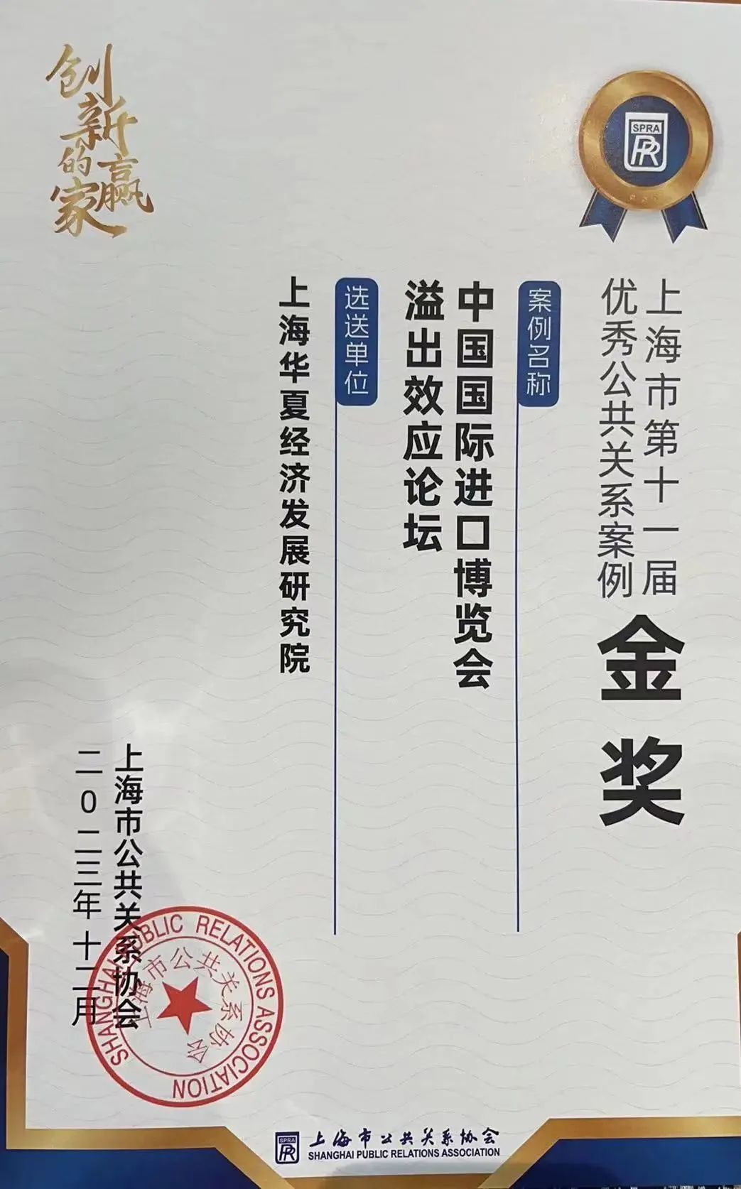 1月12日,由上海市公共关系协会主办的上海市第十一届优秀公共关系案例(2020—2022)评选终于揭晓,于张江科学会堂举行隆重的颁奖典礼。上海市公共关系协会会长沙海林,名誉会长冯国勤、胡炜,顾问江勤宏、李文新等出席;获奖单位代表、协会会员单位代表和社会各界特邀人士200余人出席。与会来宾共同见证近三年上海市公共关系的实践成果。由进博会溢出效应论坛秘书处选送的中国国际进口博览会溢出效应论坛荣获金奖,秘书处设在华夏研究院。进博会溢出效应论坛取得的成绩备受关注和肯定,将进一步伴随“越办越好”的进博会走深走实。