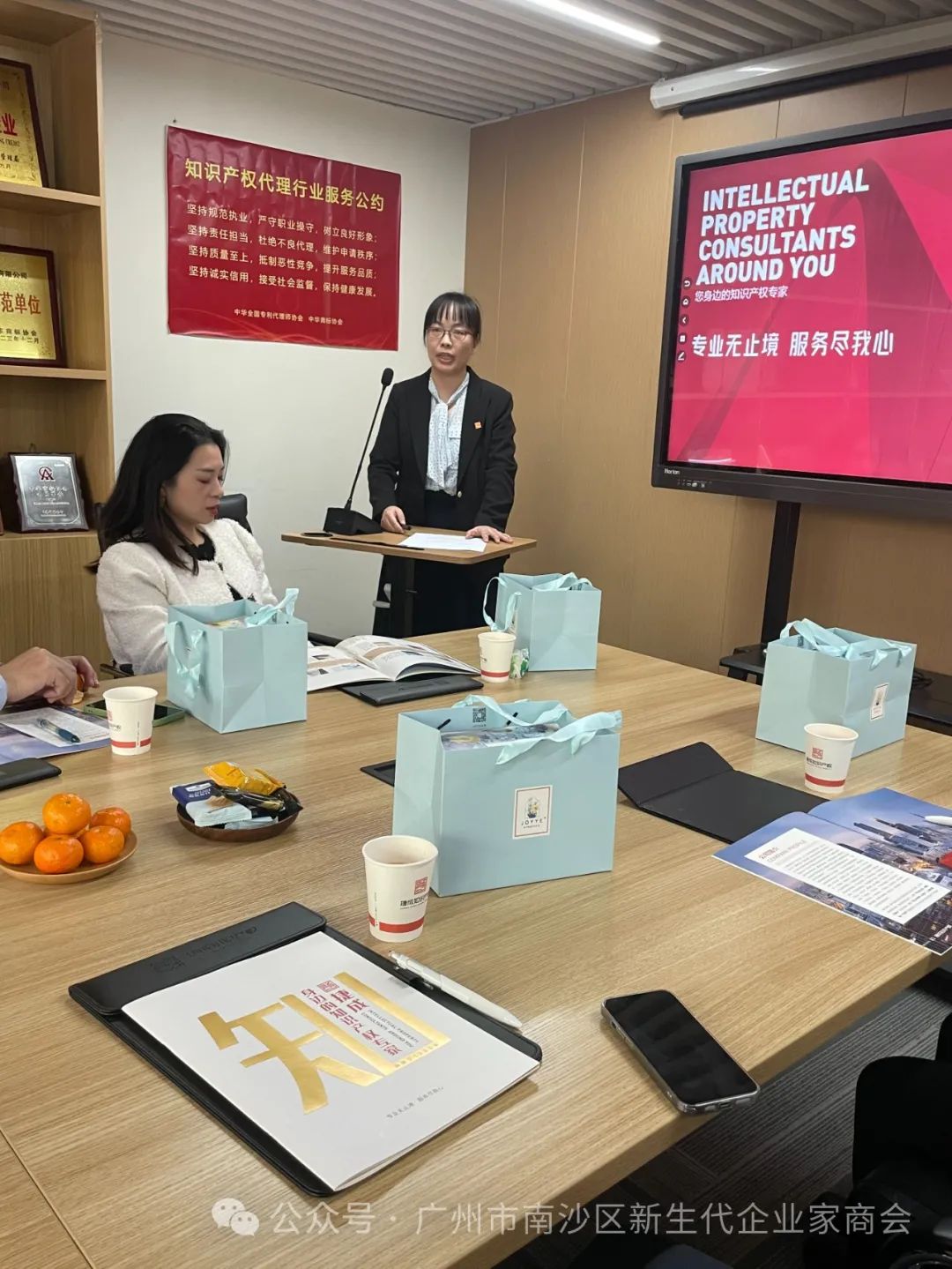 大家先参观广州市捷成知识产权代理有限公司,参观后进行座谈交流,交流中,该公司副总经理曾国赟对我会的到访表示热烈欢迎,他介绍了公司的发展历程、经营情况,主营业务及合作的单位,同时他表示很高兴加入新生代商会组织,他说商会组织是促进经济发展和推动社会进步的重要力量,可以为会员提供更多的机会和资源,同时也能够帮助商会成员在商业活动中获得更多的支持和帮助,他还表示商会的活动他会积极参与。