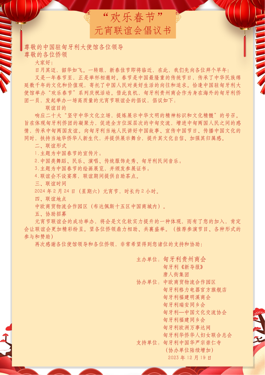 日月其迈,韶华如飞。一转眼,新春佳节即将临近,在此,我们先向各位拜个早年!又是一年春节至,正是举杯相邀时。春节是中国最隆重的传统节日,传承了中华民族绵延数千年的文化和价值观,寄托了中国人民对美好生活的向往和追求。恰逢中国驻匈牙利大使馆举办“欢乐春节”系列庆祝活动。借此良机,匈牙利贵州商会作为身在海外的匈牙利侨团一员,发起举办一场高质量的元宵节联谊会的倡议,倡议如下:一、联谊目的
