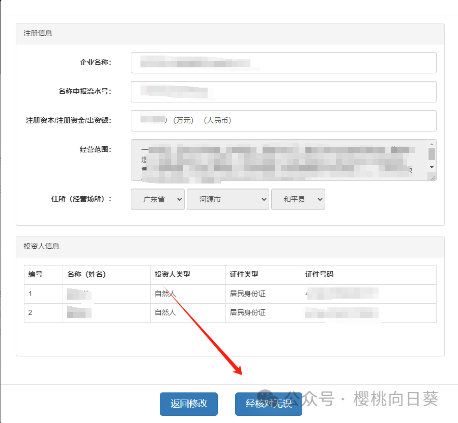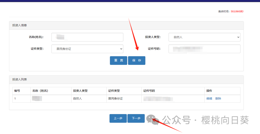 第五步,增加投资人信息,有限公司至少两个股东以上,填好之后点击下一步。