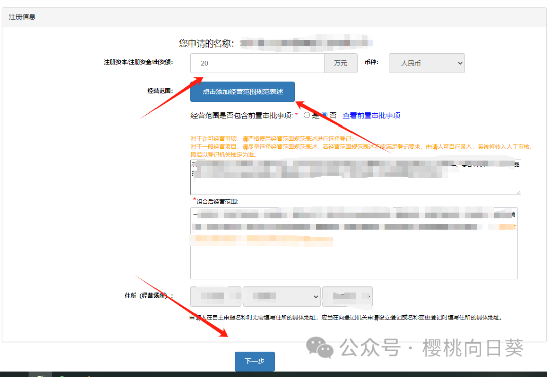第四步,如图填写资料,注册资本,经营范围,点击下一步。
