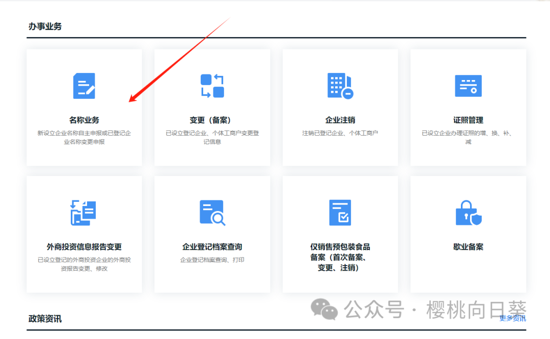 拉到办事业务,点击名称业务。