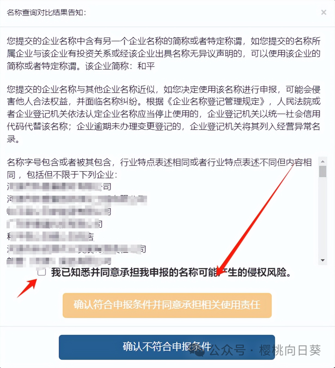 这时会出现所有相似的被别人注册了的企业名,自行判断一下风险,如果觉得风险不大就点确认符合申报条件并同意承担相关使用责任。