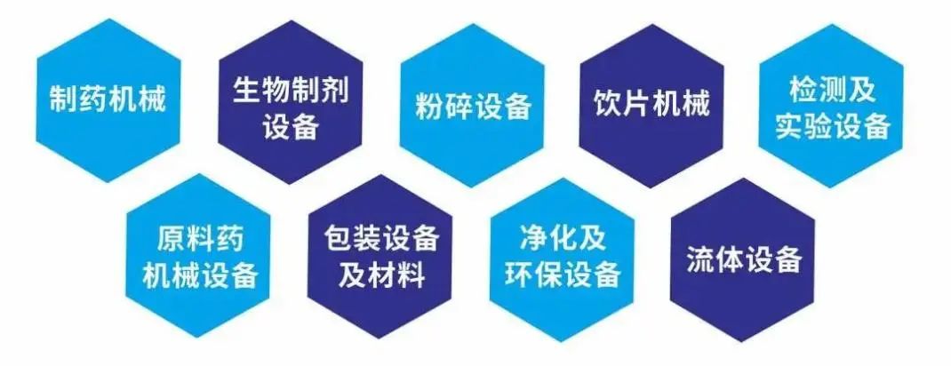 医药设备、制剂生产设备、制药用水设备、洁净空调设备、饮片机械、分离设备、混合设备、动力设备、原料机械、药用粉碎机械等。
