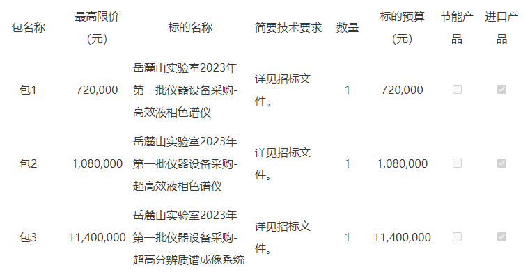 近日,岳麓山实验室就“岳麓山实验室2023年第一批仪器-超高分辨率质谱成像系统及超高效液相色谱仪等设备采购”项目发布公开招标公告,预算金额为1320万元,现邀请合格投标人参加投标。