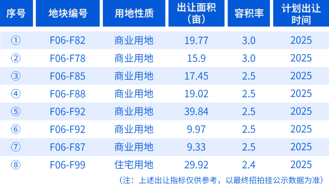 该区域可出让土地面积约为161.2亩,共计8宗地块,分别为7宗纯商业用地、1宗纯住宅用地,计划在2025年出让!