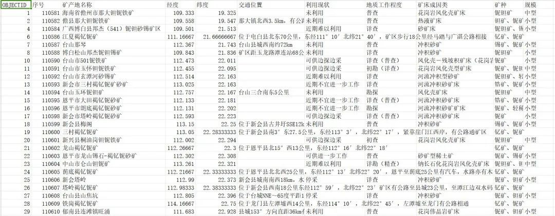 每个矿产数据包含:“矿产地名称”“经度”“纬度”“交通位置”“利用现状”“地质工作程度”“矿床成因类”“矿种规模”如下: