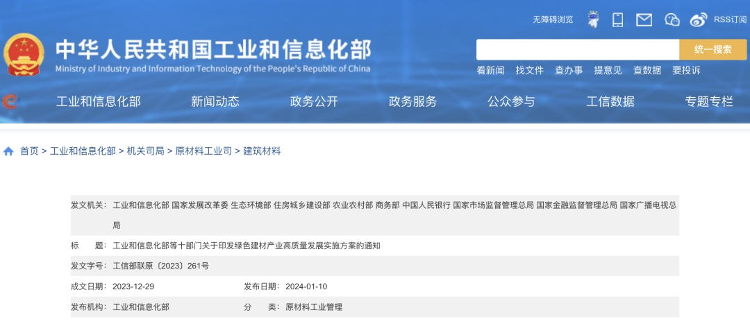 2024年1月10日,工业和信息化部 国家发展改革委 生态环境部等十部门联合发布《绿色建材产业高质量发展实施方案》。