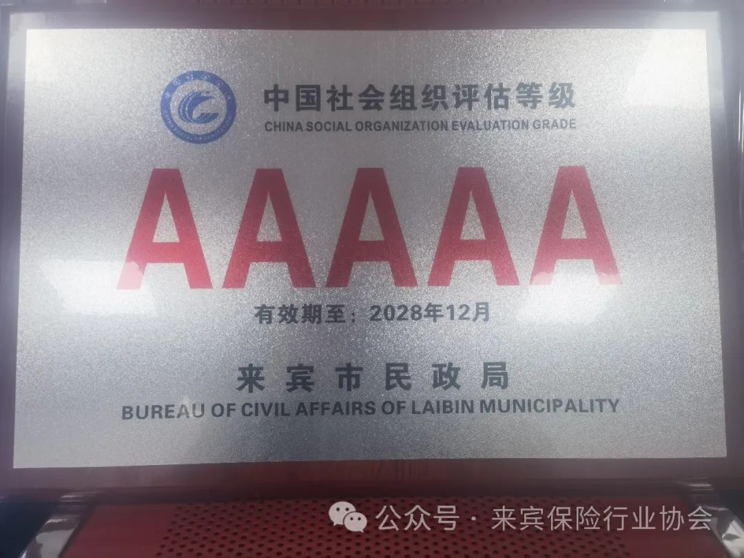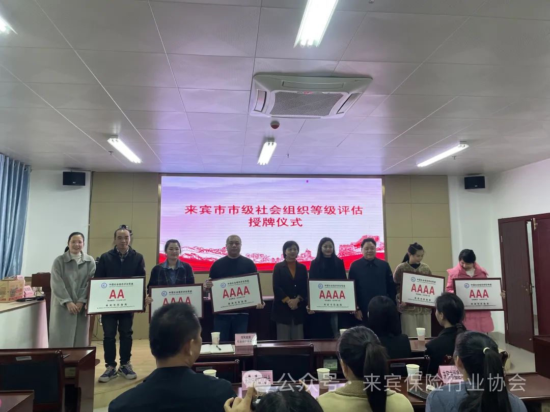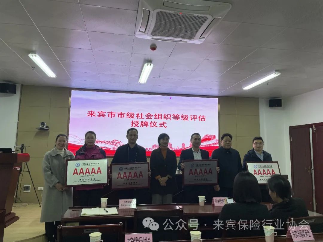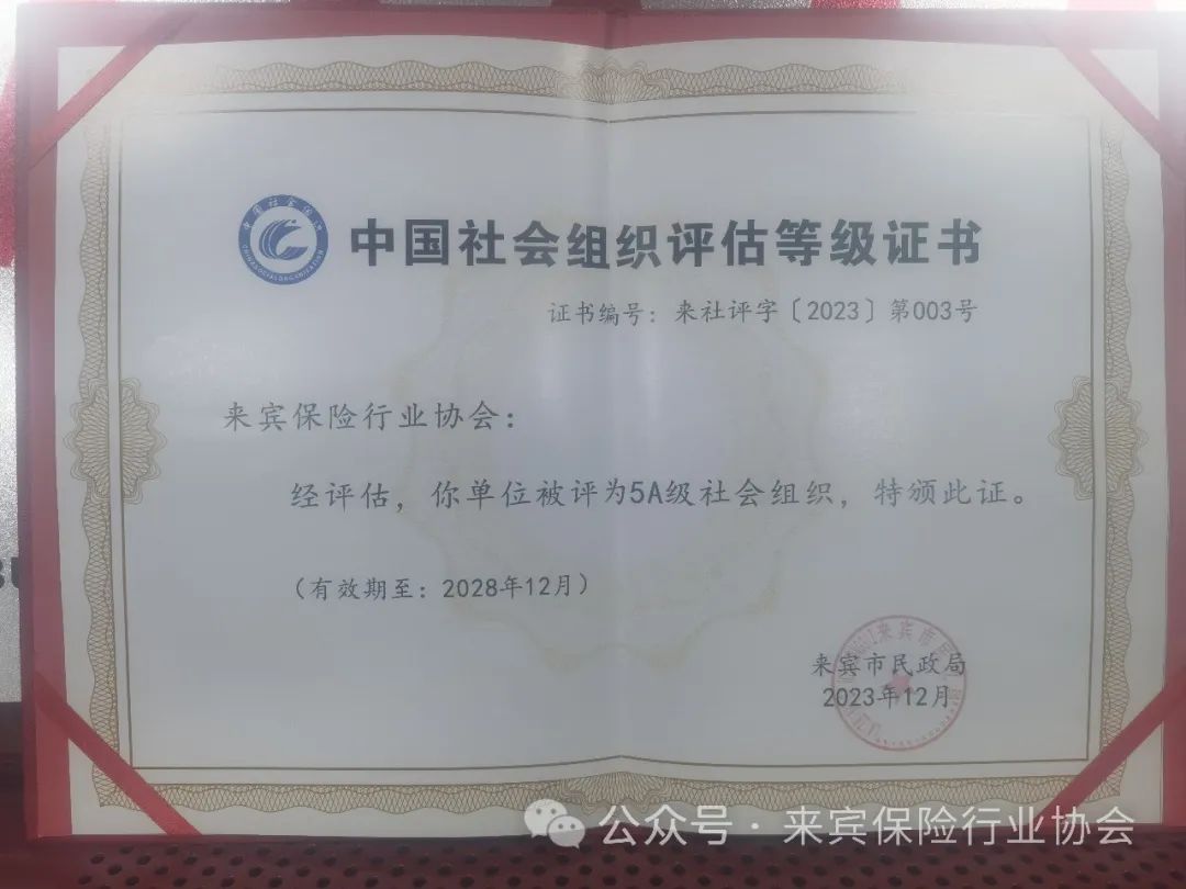 2024年1月12日上午,来宾市民政局举行隆重的授牌仪式,为社会组织评估中获评2A级以上的社会组织授牌,来宾保险行业协会获评为“5A级社会组织”,这是社会组织等级评估中的最高级别。
