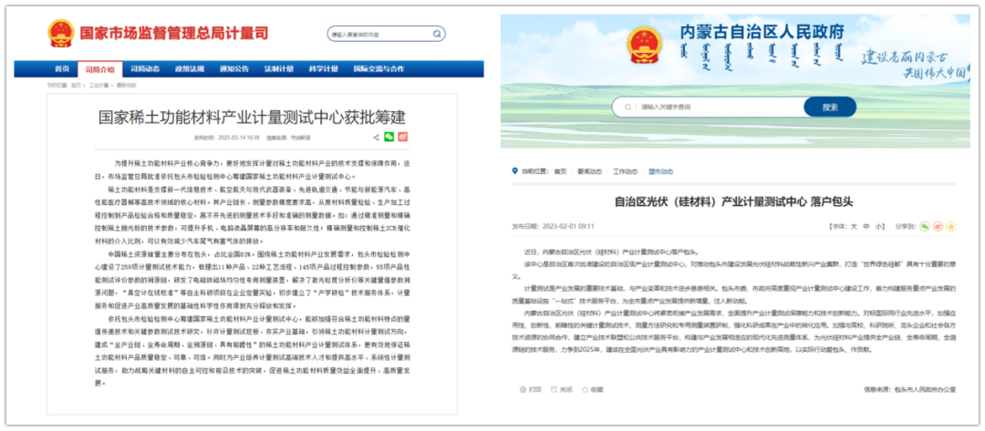2023年1月,市场监管总局批准在内蒙古包头市建设国家稀土功能材料产业计量测试中心。同月,自治区市场监管局批准在包头建设内蒙古光伏(硅材料)产业计量测试中心。