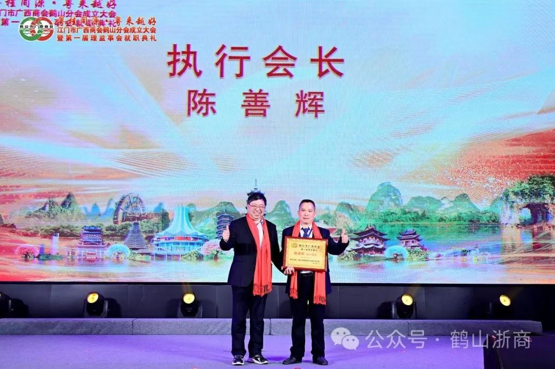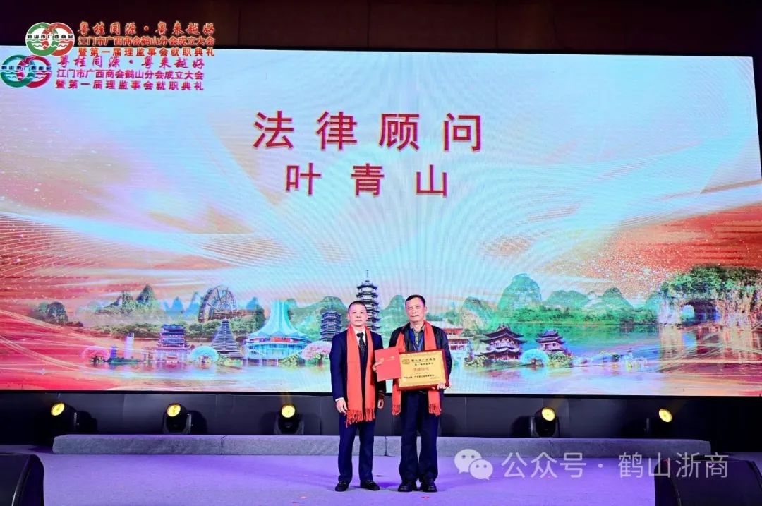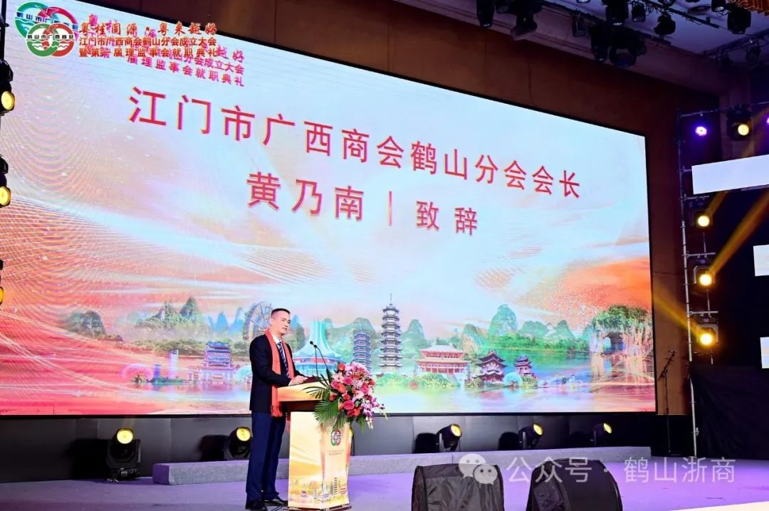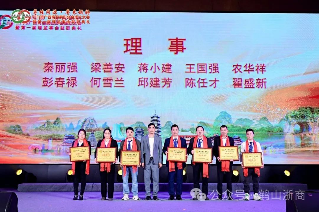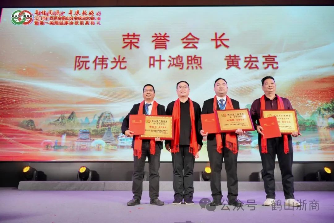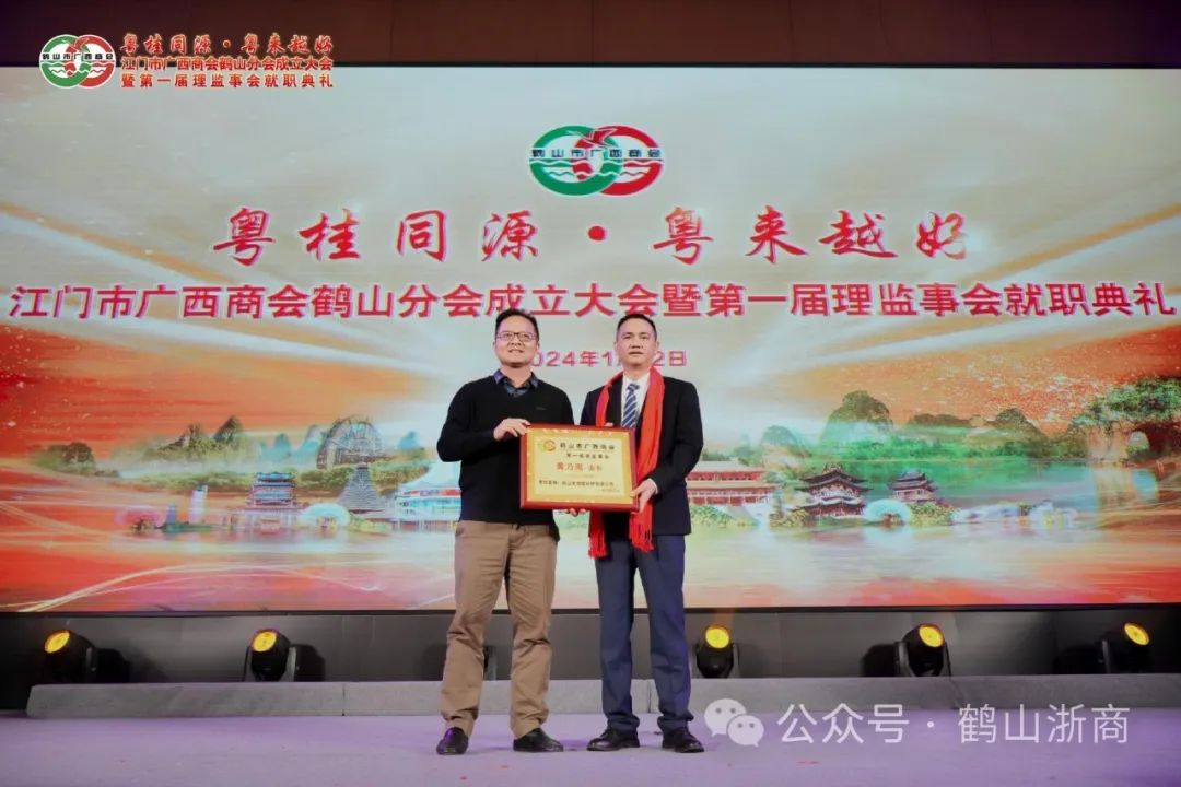 大会现场,领导嘉宾为江门市广西商会鹤山分会第一届理监事会成员颁牌。黄乃南当选为江门市广西商会鹤山分会第一届会长。