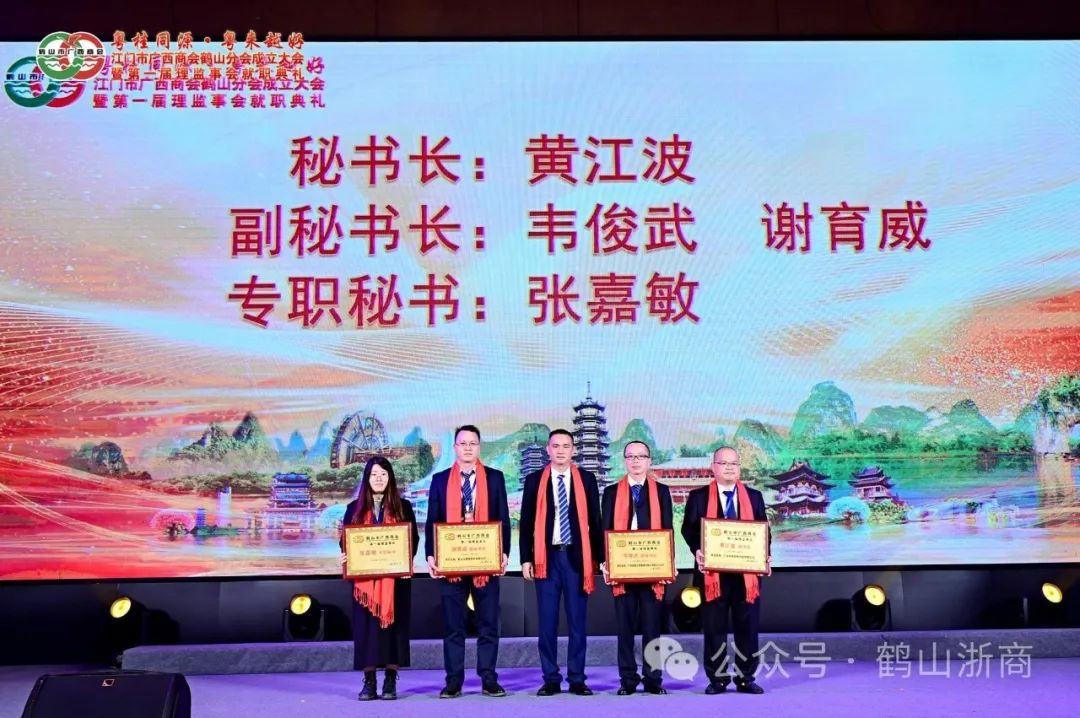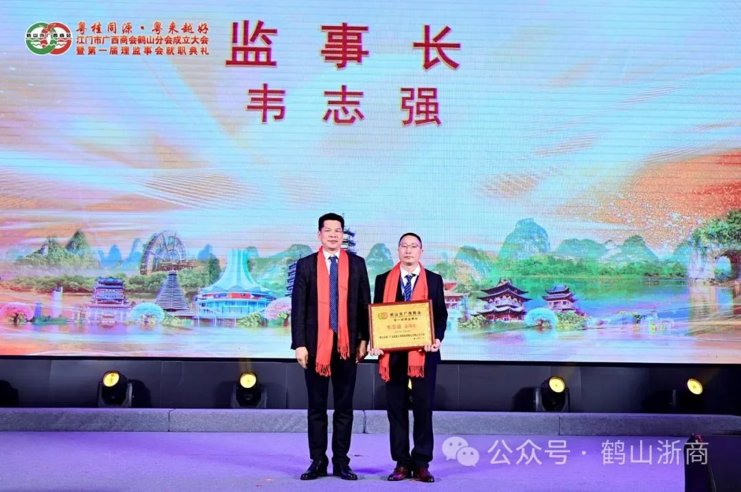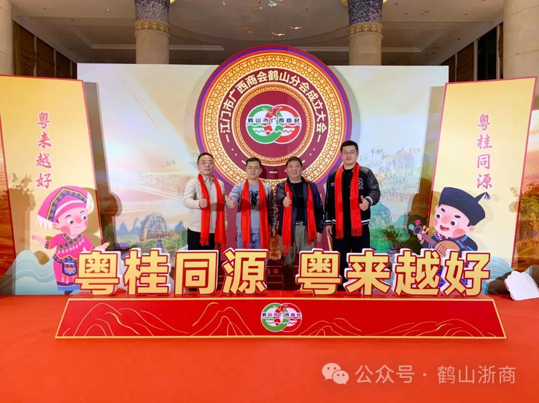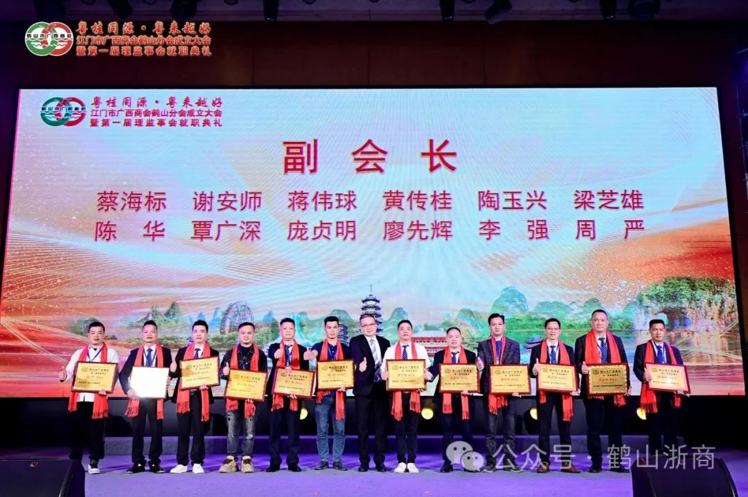 1月12日,粤桂同源,粤来越好——江门市广西商会鹤山分会成立大会暨第一届理监事会就职典礼在银业雁山酒店隆重举行。商会会长裘来安,常务副会长谢伟峰,副会长王伟、孙海栩,理事陈日新应邀参加活动。