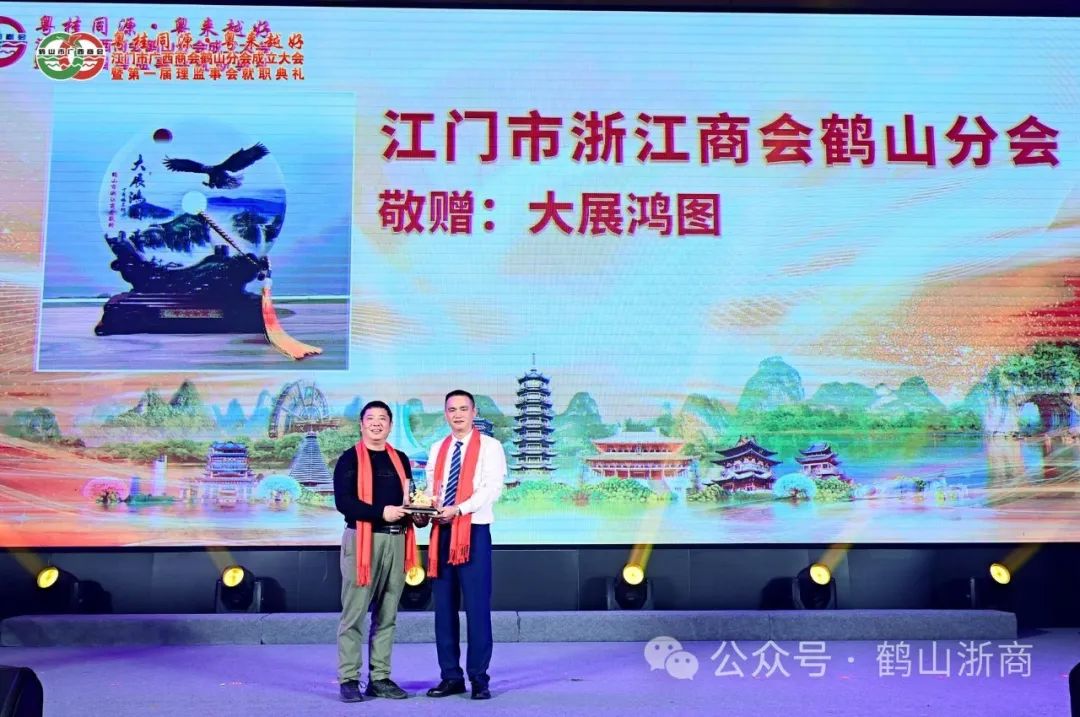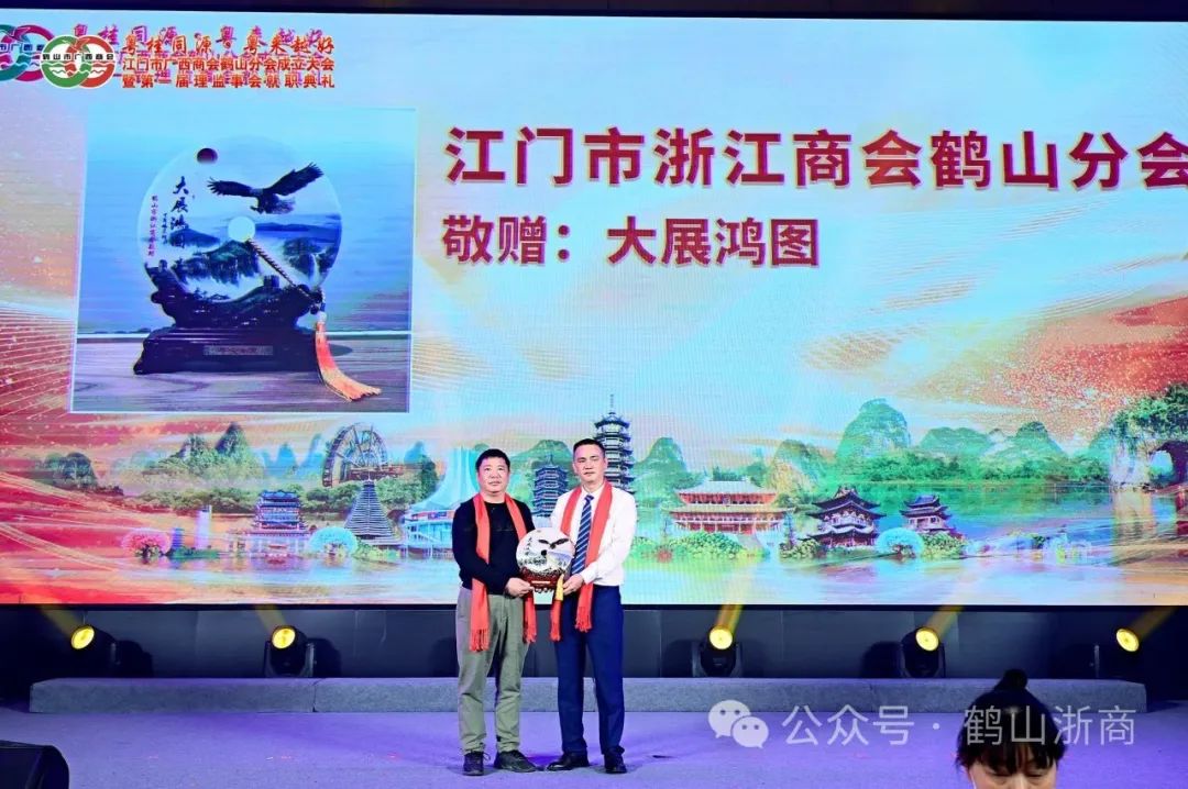 江门市广西商会鹤山分会会长黄乃南为我会送上纪念品