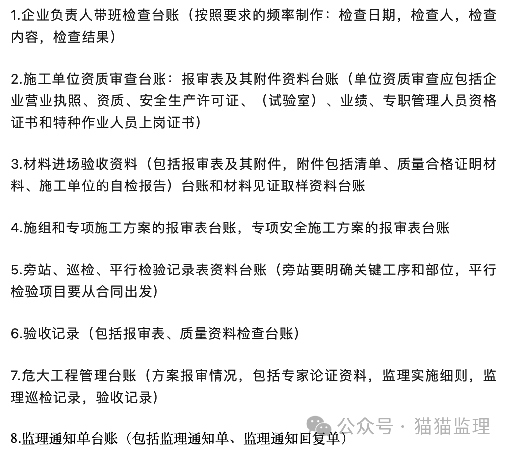 其实写得很空泛。概括下来不就是,监理的所有工作内容是否到位了。所以如果你对这些检查内容不够有头绪,或者平时工作感觉难以应对外部检查,那强烈推荐看下我制作的 现场监理工具书合集 。现在已经是第6次更新了。