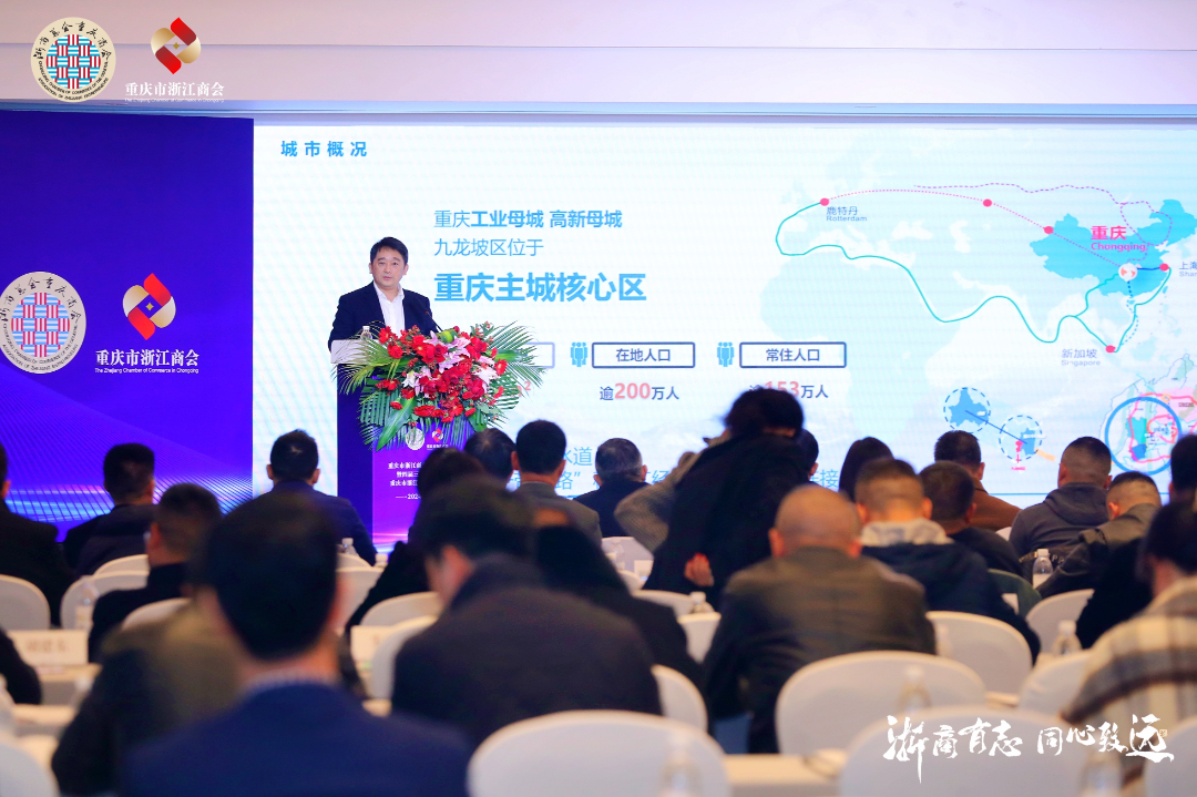 在下午浙商企业专场推荐会上,区招商投资促进局局长蒋小飞受邀进行了商务推荐,重点围绕九龙坡区位优势、“四轮驱动”功能布局、“轻氢航空数创能动”产业体系,以及“星耀龙珠”数字经济产业发展计划、中国西部氢谷发展计划、食品工业制造和贸易发展计划、九龙艺术产业发展计划等进行了详细的产业推介。
