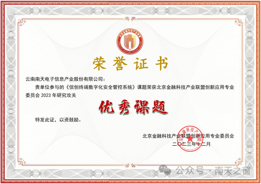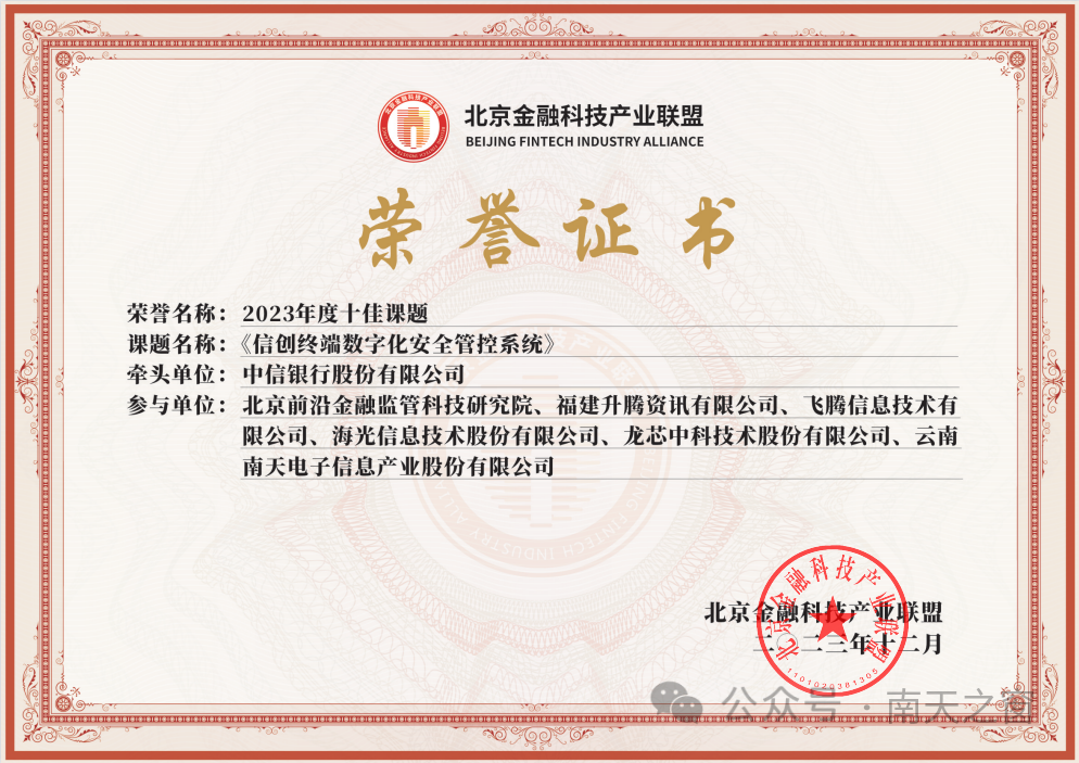 南天信息参与的《信创终端数字化安全管控系统》课题获评北京金融科技产业联盟“2023年度十佳课题”、创新应用专业委员会2023研究攻关“优秀课题”,《基于国产芯片的密码模块实现技术研究》获评创新应用专业委员会2023研究攻关“良好课题”。