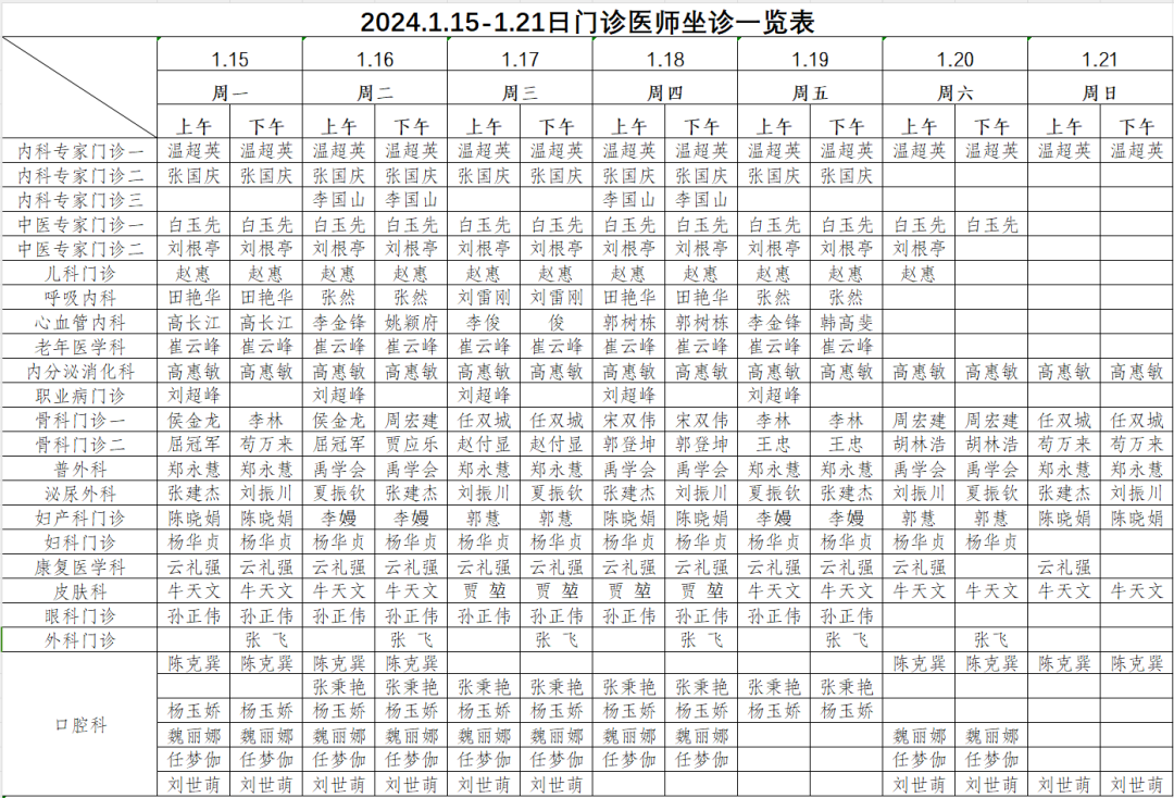 郑煤集团总医院2024年1月15日-1月21日门诊专家坐诊表