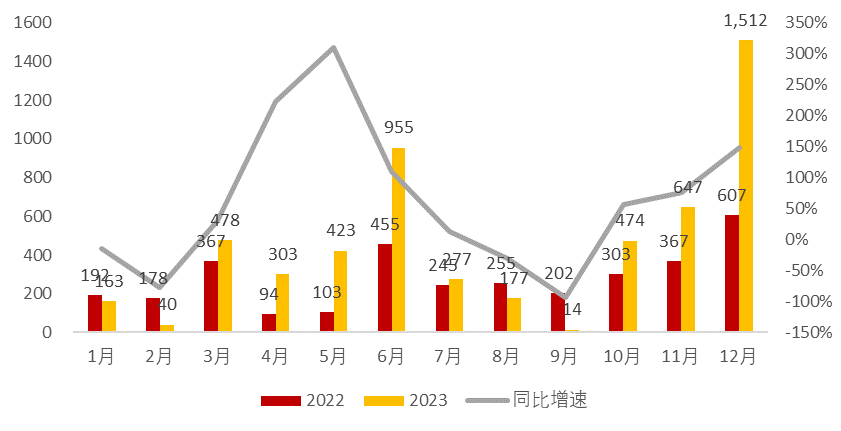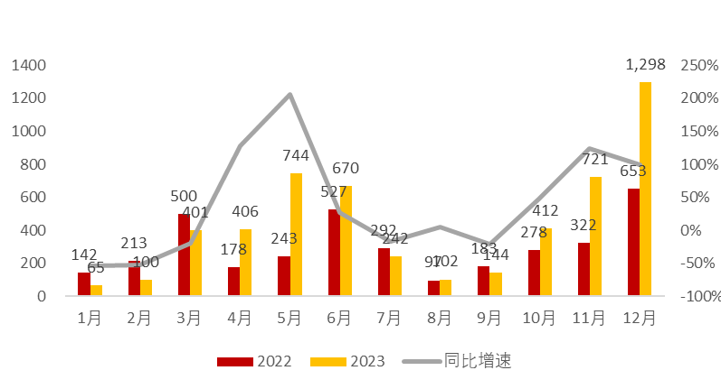 为响应国家及地方燃料电池汽车政策落地,相关示范项目氢车需求上升,需求信号释放下部分车企增加库存车辆,2023年12月我国氢燃料电池汽车产销分别为1298辆和1512辆,同比分别增长98.8%和149.1%,环比分别增长80.03%和133.69%;2023年我国氢燃料电池汽车累计产销分别完成5303和5463辆,同比分别增长55.3%和72%,产销两端快速增长,氢燃料电池汽车市场整体利好。