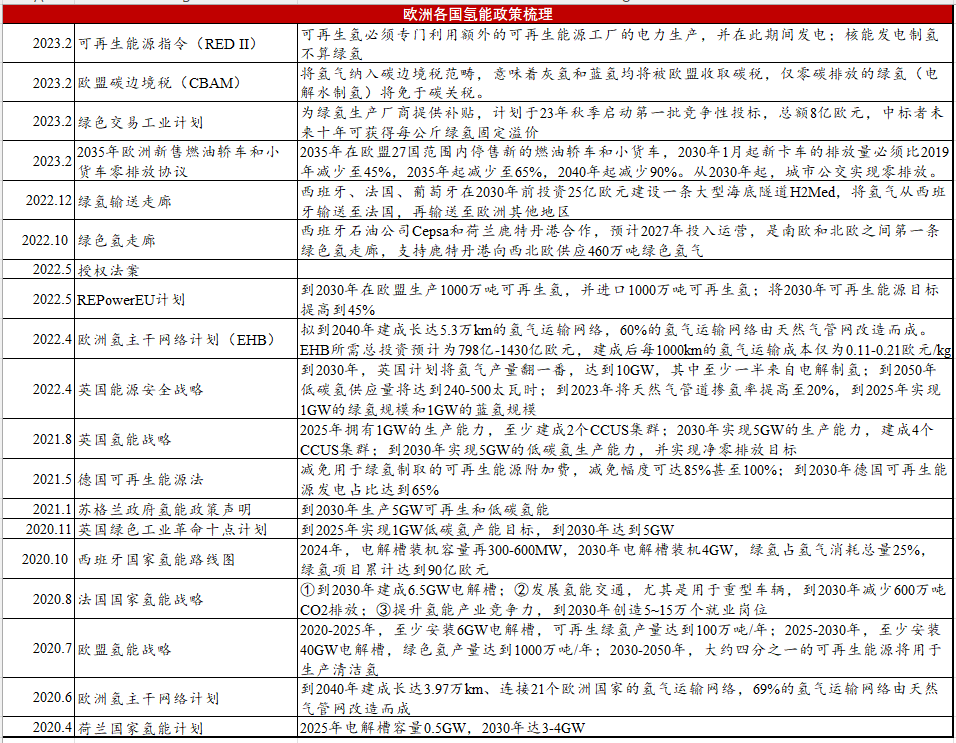 欧盟到30年自产1000万吨可再生氢,德国30年电解槽装机量达到10GW。REPowerEU中提出到2030年欧盟将达到自产1000万吨可再生氢,进口1000万吨可再生氢(600万吨氢+400万吨氨)的目标。以1000标方电解槽为例,按年利用4000小时计算,一台电解槽一年可产氢314.65吨。要达到1000万吨的产量,电解槽装机规模约139.04GW。为支持可再生能源发展规划,保持本土产业优势,欧盟委员会于2023年3月发布了《净零工业法案》草案。草案提出欧盟电解槽制造商应进一步提高产能,使2030年电解槽总装机量达到100GW。欧洲各国也纷纷提出了电解槽装机目标,支持绿氢产业的发展,其中德国计划2030年实现10GW电解槽装机,意大利5GW,西班牙4GW,荷兰4GW。