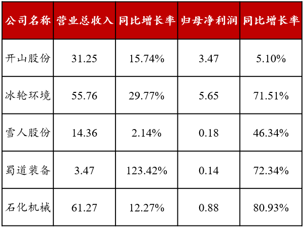 2023年以来我国食品冷链和工业制冷等领域需求增长,利好上游压缩机行业。压缩机企业开山股份、冰轮环境、雪人股份、蜀道装备、石化机械前三季度营业收入分别实现31.25/55.76/14.36/3.47/61.27亿元,同比增长15.74%/29.77%/2.14%/123.42%/12.27%;归母净利润分别实现3.47/5.65/0.18/0.14/0.88亿元,同比增长5.1%/71.51%/46.34%/72.34%/80.93%。