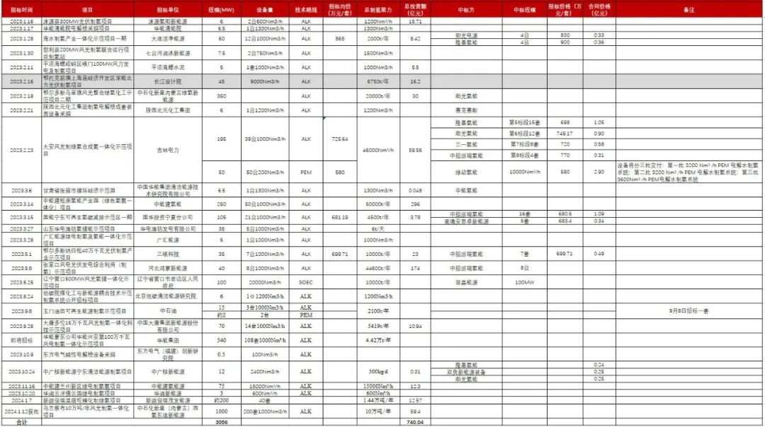 2023年国内电解槽招/中标规模2.03GW,同比增长321%。11-12月电解槽招/中标主要涉及中能建兰州新区绿电制氢氨项目、中国能建2023年制氢设备集中采购项目和华润云浮佛云园绿电制氢项目。中能建兰州新区绿电制氢氨项目EPC总承包工程建设规模为电解水制氢生产能力15000Nm³/h,操作时间5973h/年,氢气产量8000吨/年,合成氨产量9000吨/年,配套制氮生产能力900Nm³/h,合成氨及制氮操作时间8000h/年;项目计划开始施工日期为2024年3月1日, 2024年12月20日前完成中间交接,2025年2月18日前产出合格产品。12月14家企业入围中国能建125套电解槽招标,预估招标总量为125套电解槽设备,其中200Nm³/h PEM电解槽15套,1000Nm³/h 碱性电解槽100套,总计515MW。招标分为碱性电解槽和PEM电解槽2个标段,其中碱性电解槽报价范围在1380.72-1597.20元/kW,单台设备价格在690.36-798.6万元之间,单台设备价格平均价格为751万元;PEM电解槽报价范围在5800-8980元/kW,单台设备价格在580-898万元之间,单台设备价格平均价格为756万元,PEM电解槽价格是碱性电解槽的5倍左右。华润云浮佛云园绿电制氢项目EPC总承包工程招标发布公告,项目拟建设600Nm³/h水电解制氢装置,于2024年1月25日开工,2024年8月31日投产。