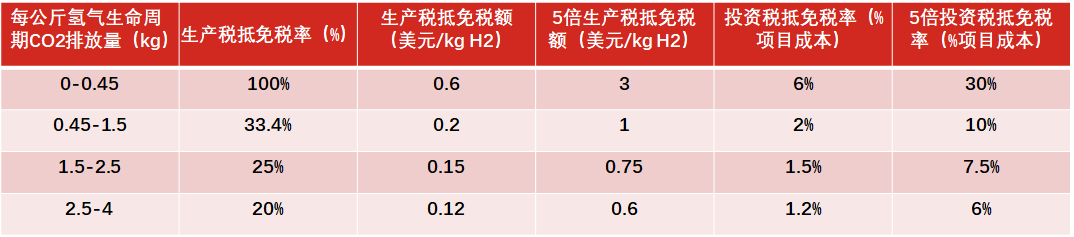IRA法案为氢气生产商提供高达 3 美元/千克税收抵免。IRA对清洁氢能的定义是4kg-CO2/kg H2,排放低于这个标准都可获得氢能生产补贴,法案中合格清洁氢气的基本税收抵免率为0.6美元/kg,并根据所生产的氢气的生命周期排放量进行调整,每公斤氢气的生命周期二氧化碳当量排放量低于0.45kg时将获得最高3美元/千克的税收抵免,每公斤氢气的生命周期二氧化碳当量排放量在0.45kg-1.5kg时将获得最高1美元/千克的税收抵免,每公斤氢气的生命周期二氧化碳当量排放量在1.5kg-2.5kg时将获得最高0.75美元/千克的税收抵免,每公斤氢气的生命周期二氧化碳当量排放量在2.5kg-4kg时将获得最高0.6美元/千克的税收抵免。