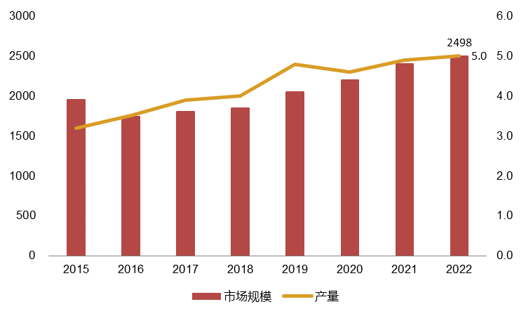 近年来,我国气体压缩机行业取得长足进步,2016年我国空气压缩机行业市场规模约为1739.9亿元,2016至2022年行业市场规模稳定持续上升,2022年中国空气压缩机市场规模达到2498.4亿元,期间复合增速为6.22%。2022年气体压缩机产量达到5亿台,同比增长2.15%。