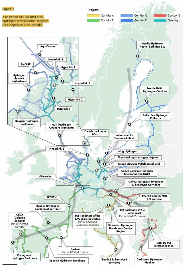 欧洲氢气主干管网(EHB)计划是欧洲为实现2030年氢能目标而采取的重要措施,旨在推动欧洲的能源独立和减排目标。该计划涉及33个能源基础设施运营商,目标是通过现有和新的氢基础设施,创建一个竞争性的、液态的、泛欧洲的可再生和低碳氢市场,促进市场竞争、供应安全和跨境合作。到2040年在28个欧洲国家建立大约53000公里的氢管道基础设施,沿拟议的陆上主干线运输超过1000公里的氢,平均每千克氢0.11-0.21欧元,使EHB成为最具成本效益的选择用于大规模的长途氢运输;如果完全通过海底管道运输氢,每运输1000公里氢的成本为每千克0.17-0.32欧元。