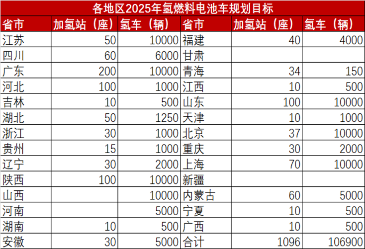 为推动未来加氢站和氢燃料电池汽车的落地使用数量到进一步突破,近年来多地区在能源规划中对加氢站数量、氢燃料汽车数量等指标给予了明确要求。目前已有27个省/直辖市及自治区对于2025年要达成的加氢站和氢车数量目标予以详细规定,明确截至2025年氢能规划部署建设加氢站共1096座和氢车共10.69万辆,加氢站方面广东省排名第一,规划建设200座加氢站,氢车方面江苏、广东、陕西、山西、山东、北京、上海的目标均达到10000辆。近日广东公布了163座加氢站选址,覆盖广州市内主要干线,各省规划加速推进。
