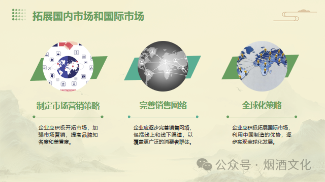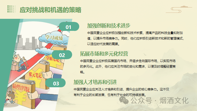 面对新的历史时期,中国民营企业需要采取一系列措施来推动自身的发展。首先,企业需要加强自主创新,提高产品的科技含量和附加值,以提升市场竞争力。其次,企业应积极拓展国内市场,并逐步走向国际市场,以实现市场的多元化。此外,企业还需要加强人才培养和引进,提升企业的核心竞争力。同时,企业应关注社会责任,实现可持续发展。