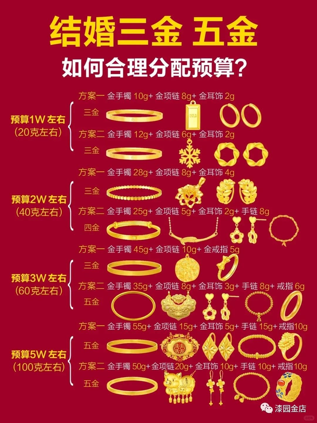 方案二:金手镯35g十 金项链8g十金耳饰3g十金手链8g十金戒指6g(五金)