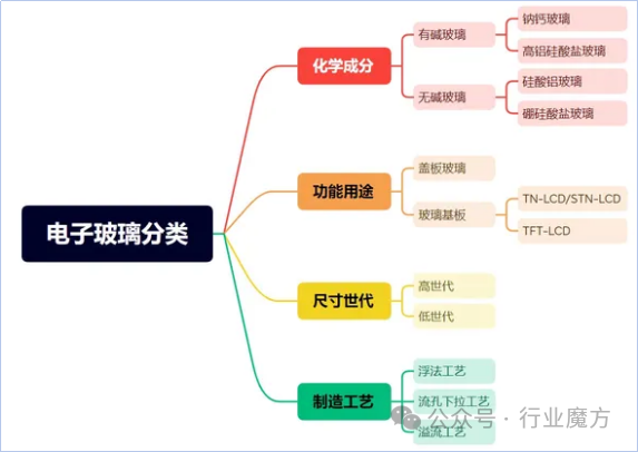按照上图所示的内容,电子玻璃可以根据多种方式进行分类,比如化学成分(有碱玻璃、无碱玻璃)、功能用途(盖板玻璃、面板玻璃)、尺寸世代(高世代、低世代)以及制造工艺(溢流法、浮法、流孔下拉法)进行分类。