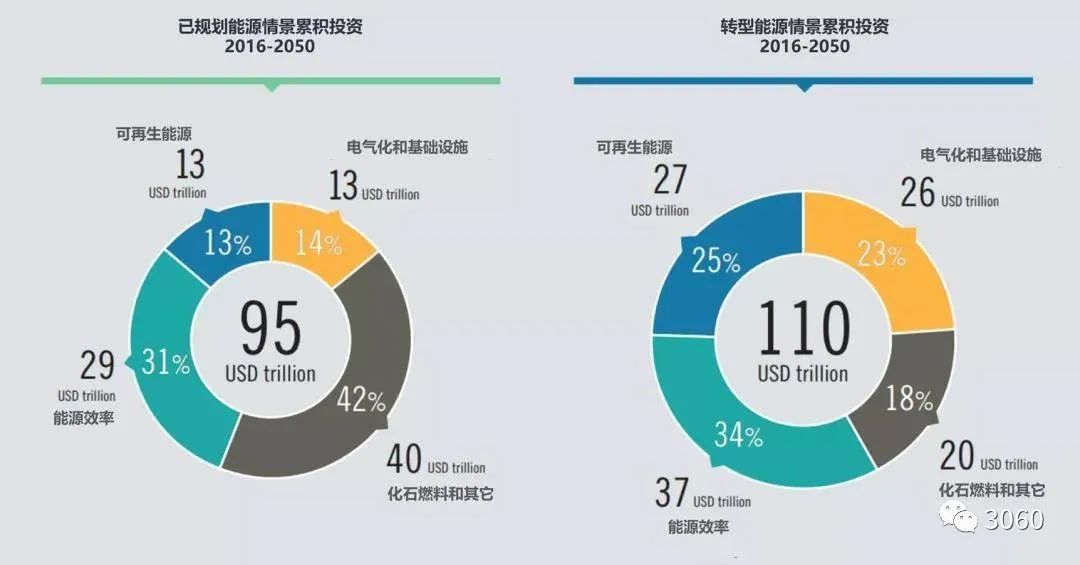 图 | 两种能源转型情景下累计投资金额预测(2016-2050 年),来源:IRENA