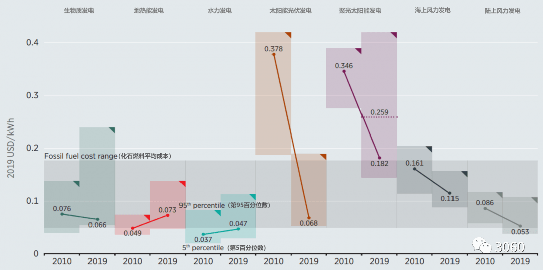 图 | 光伏、风电度电成本快速下降(2010-2019 年),来源:IRENA
