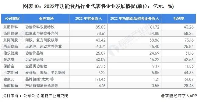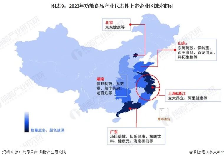 《报告》显示,我国功能食品企业主要分布在华南地区,其次是在华东、华北等地区以及其他地方如甘肃、黑龙江、内蒙古、西藏等省份,虽然有企业分布,但是数量极少。从代表性企业分布情况来看,广东、山东等地代表性企业较多。汤臣倍健、仙乐健康、东鹏饮料等代表企业分布在广东地区;东阿阿胶、保龄宝等主要分布在山东地区。