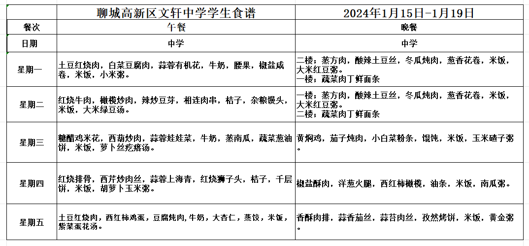 聊城高新技术产业开发区文轩中学一周(1月15日——1月19日)学生食谱