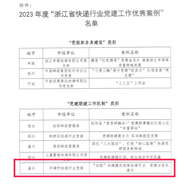 近日,浙快党发〔2024〕1号文件发布2023年度“浙江省快递行业党建工作优秀案例”名单,平湖市快递行业党委入选“党建联建机制”类别优秀案例。