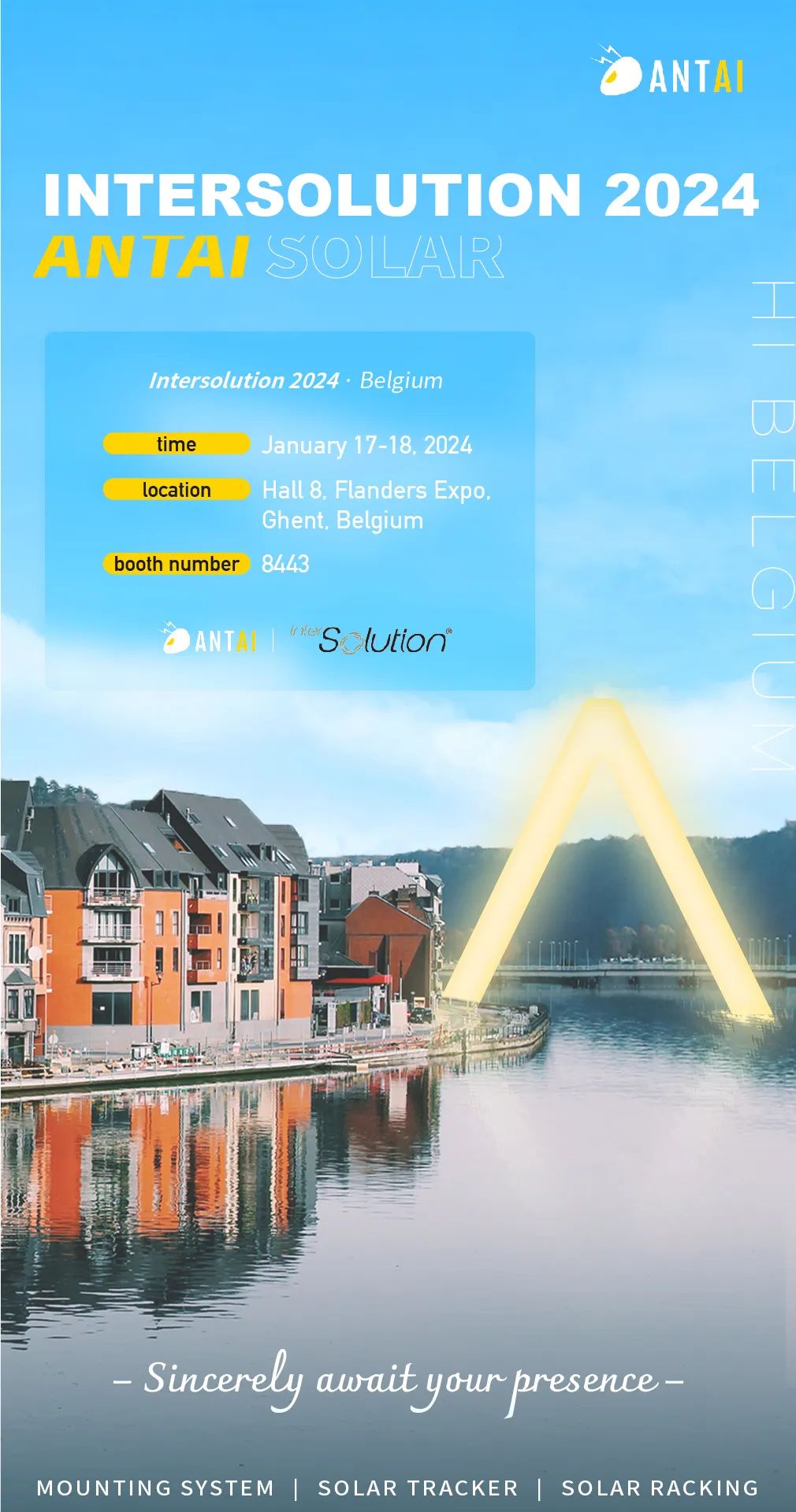 此次,安泰新能源将携光伏支架系统解决方案首次亮相比利时国际太阳能展8号馆,8443展位,为欧洲客户带来安泰最新研发的屋顶及地面光伏支架产品。