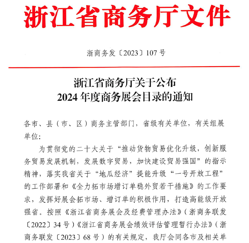 近日,浙江省商务厅会同各市及相关单位研究确定了2024年度商务展会目录。2024年拟举办和支持展会359个,包括:自办类展会33个(货物贸易展会15个,服务贸易展会15个,外经展会3个);重点类展会71个;其他类展会255个(国际贸易展230个,国内贸易展 25个)。