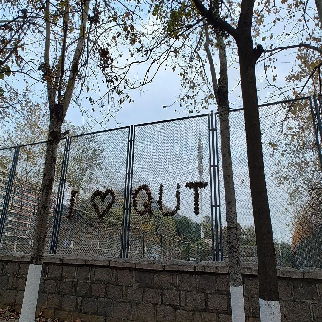同学们用落叶组成的I❤️QUT,彰显青理学子对学校的爱。