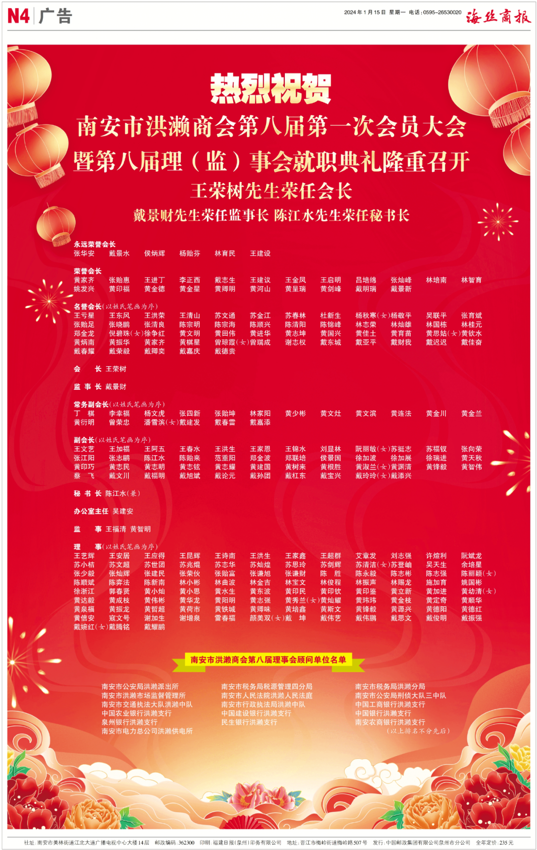 1月15日下午,南安市洪濑商会第八届第一次会员大会暨第八届理(监)事会就职典礼在金鹿大酒店举行。南安市政协常委、泉州市荣盛置业投资有限公司董事长王荣树当选会长。