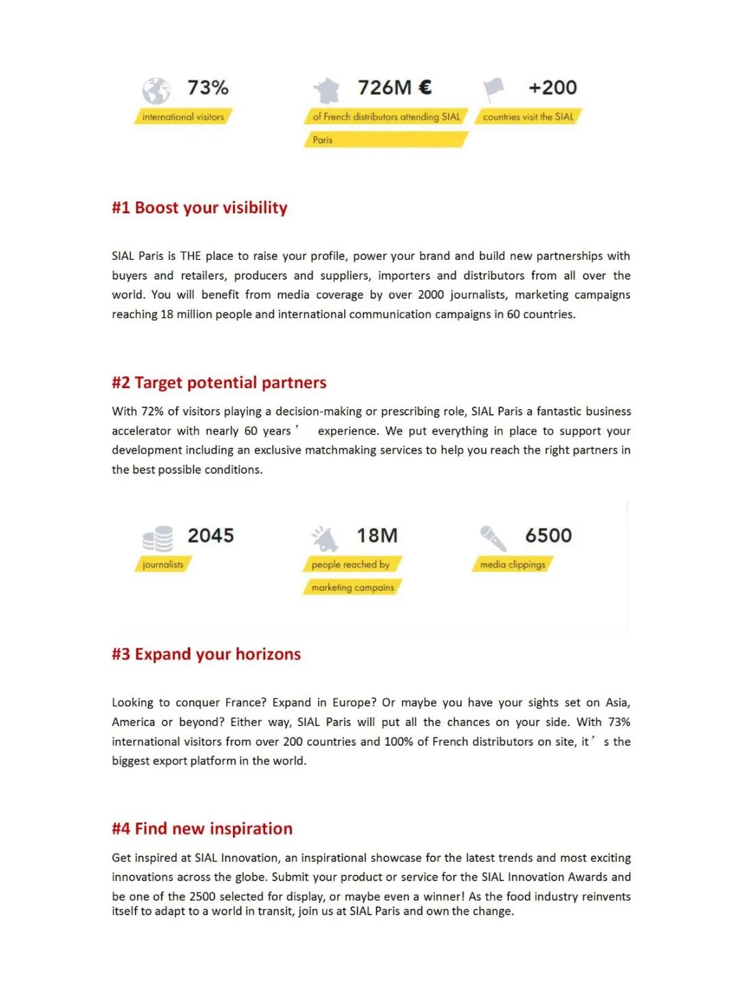 法国国际食品展会sial由爱博展览集团主办,爱博展览集团是法国第一大展览集团,世界十大展览集团之一,每年主办近60个专业展览会。法国巴黎国际食品及饮料博览会创建于1964年,迄今已有五十多年的历史。该展与德国的Anuga食品展每年交错举行,是整个欧洲乃至世界最大的食品行业盛会。展会覆盖全球无地域限制,引领全球食品行业的流行趋势,是全球最受欢迎的食品展。