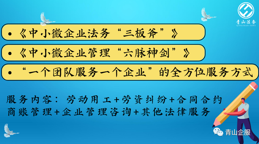广东青山法务服务有限公司是一家聚焦中小微企业服务的专业机构,秉承着为客户提供最好性价比服务的初心,从解决实际问题出发,创造了简单、实用、高效的中小微企业法务服务解决方案 —《企业法务‘三板斧’》及助推中小微企业转型升级的《企业管理‘六脉神剑’》。