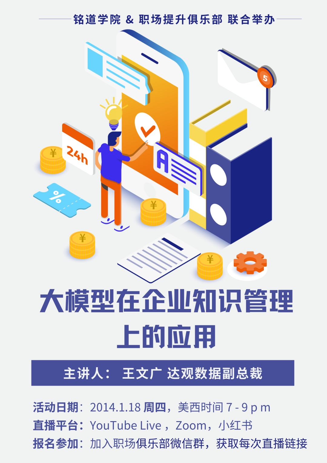 本次职场提升俱乐部与铭道学院合作,我们有幸邀请到达观数据副总裁王文广先生,一位在自然语言处理、知识图谱、大模型等领域领先的技术专家,为我们深入剖析大模型在企业知识管理中的应用和未来。